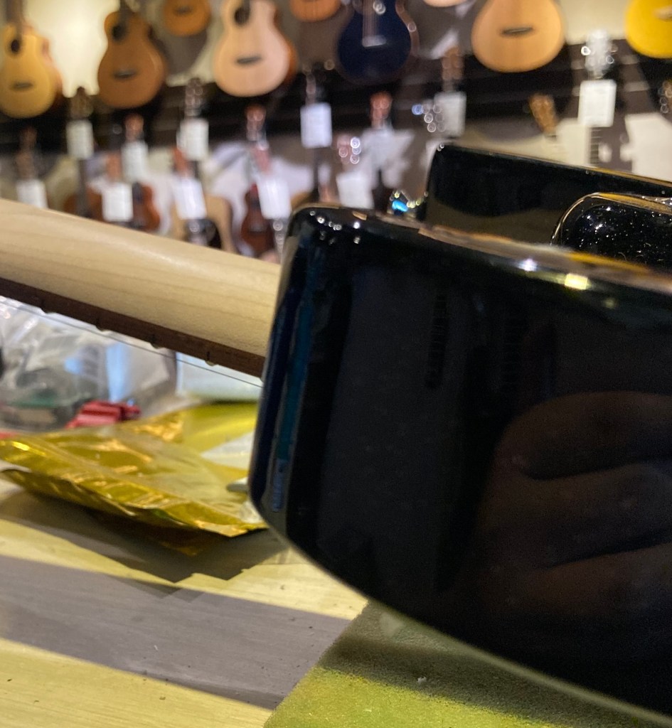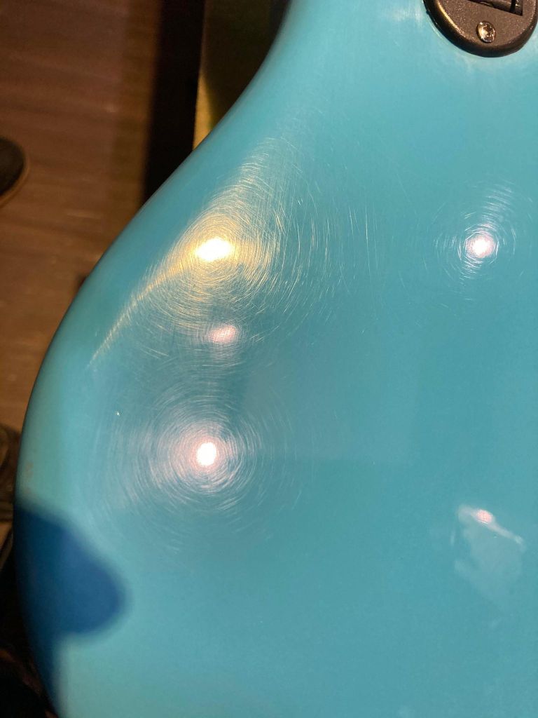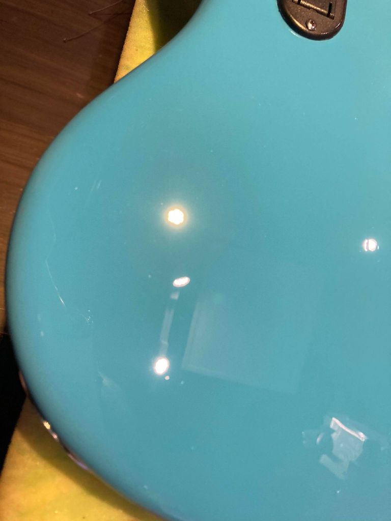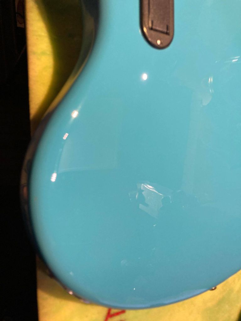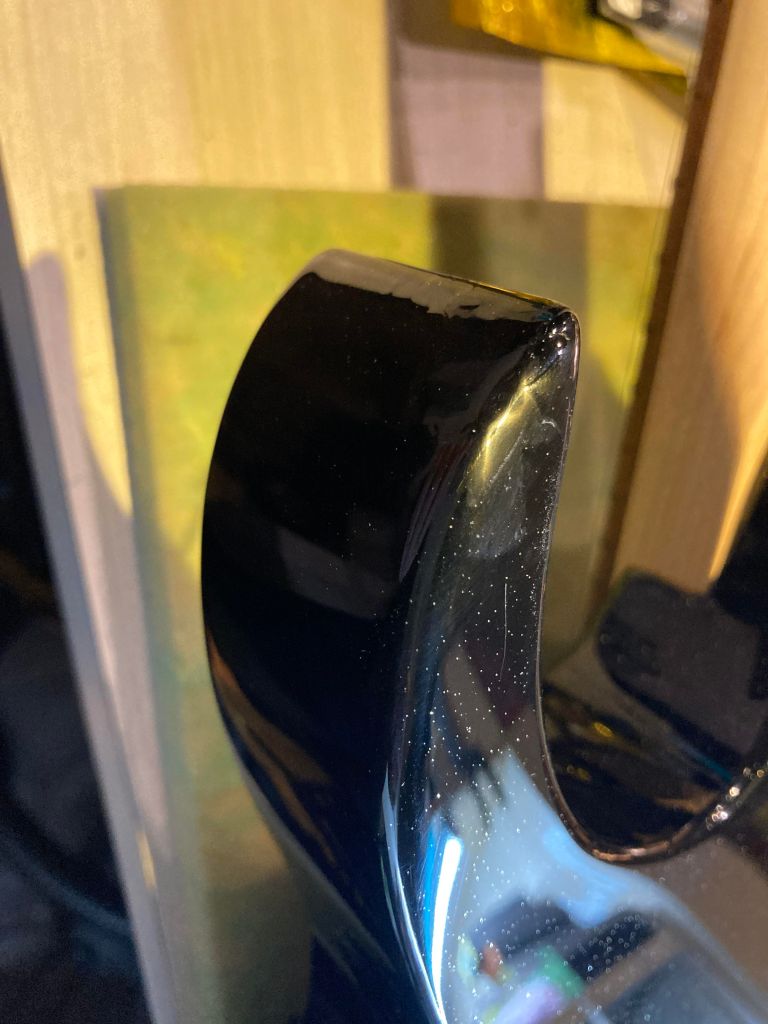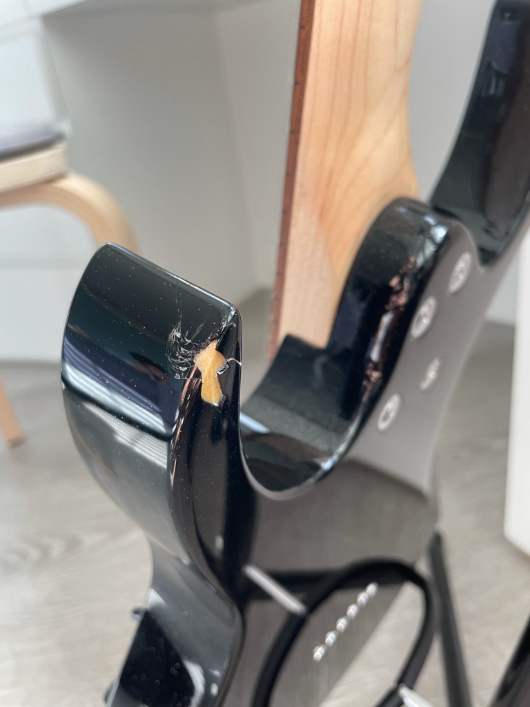 本次的示範對象為某位客戶的吉他 , 傷口爆裂 , 底漆都透了 , 可以直接看到木頭,由於這把電吉他所使用的是Black Prism Flake這類帶有亮粉的烤漆 , 採用傳統的點補的補漆方式可能會因為亮粉而色差明顯 , 亮粉分布不均勻。然而局部重噴的話 , 調色跟添加亮粉的工時跟預算又太高了 , 是故本例最適合採用Fill n’Finish Black , 省時高效 , 色差低。